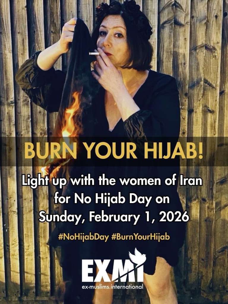 Ex-MI applauds women everywhere who reject religious patriarchy. On “World No Hijab Day” on 1st February, burn your hijab to reject Islamic patriarchy, laws and norms that criminalizes women’s autonomy and demands submission. Stand in solidarity with those who recognize the hijab not as a cloth, but as a symbol of control.